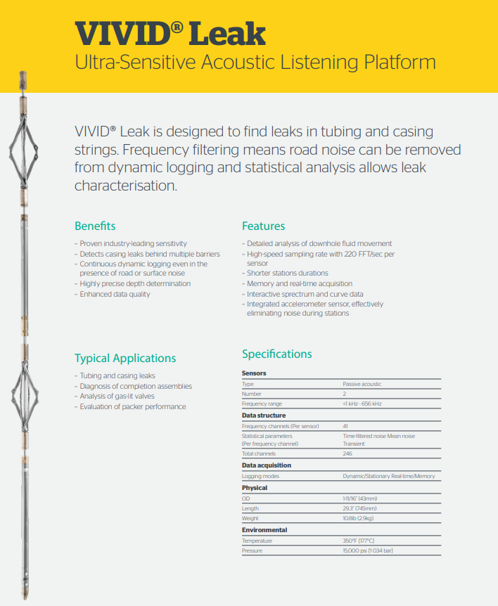 VIVID® Leak is designed to find leaks in tubing and casing strings. Frequency filtering means road noise can be removed from dynamic logging and statistical analysis allows leak characterization.